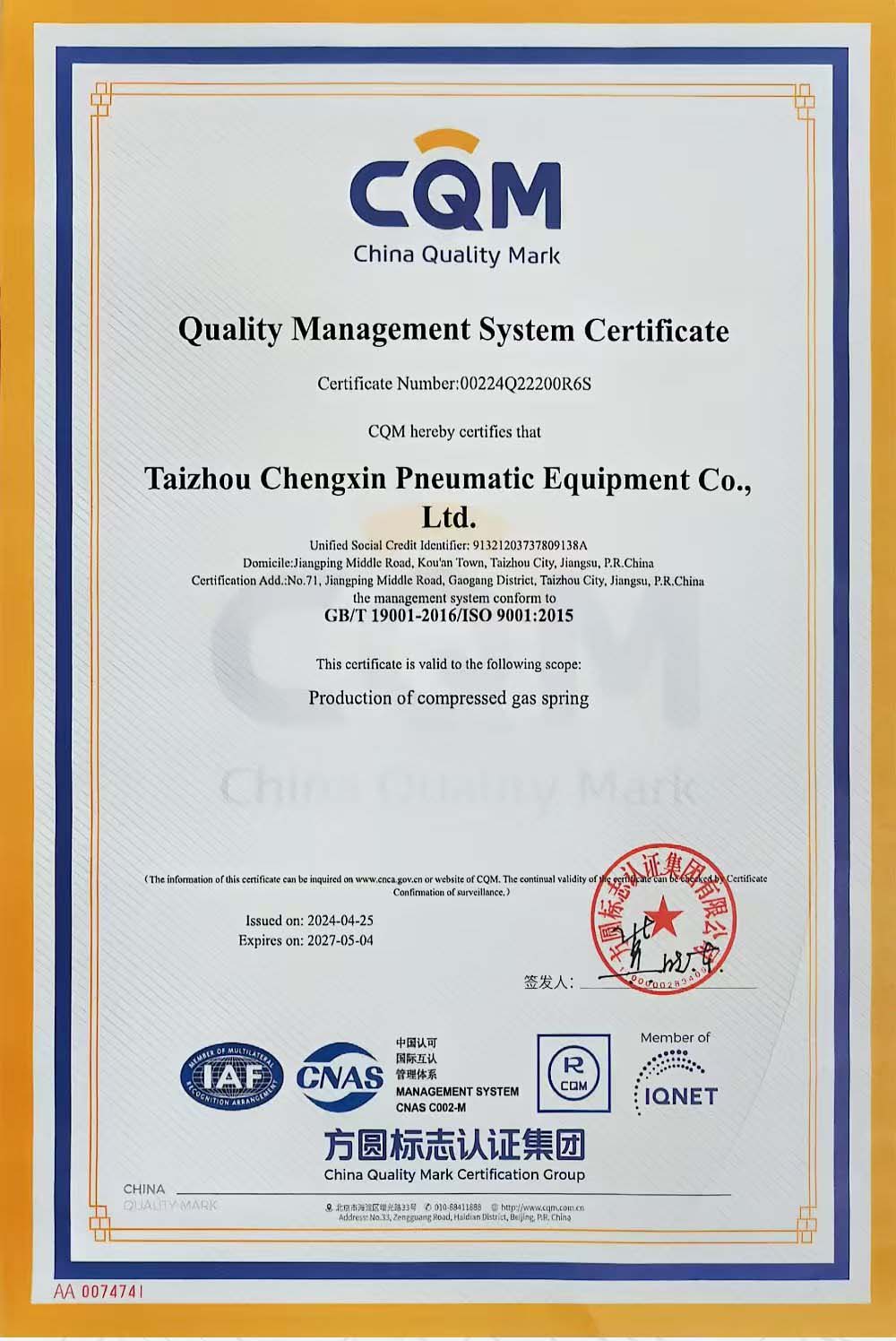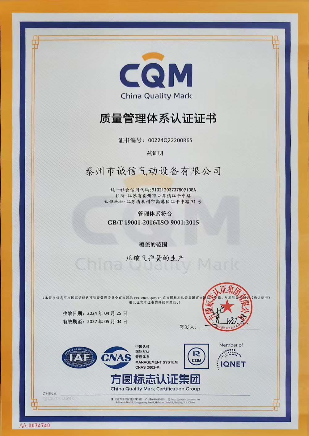 泰州市誠(chéng)信氣動(dòng)設(shè)備有限公司系專(zhuān)業(yè)性生產(chǎn)氣動(dòng)系列產(chǎn)品的企業(yè),工廠(chǎng)技術(shù)力量雄厚,生產(chǎn)設(shè)備精良,檢測(cè)設(shè)備齊全,主要產(chǎn)品有四大系列,一千多個(gè)品種,即YQ型系列壓縮氣彈簧、BYQ型壓縮氣彈簧、JKQ型系列可鎖定氣彈簧、LQ系列拉伸氣彈簧。產(chǎn)品質(zhì)量嚴(yán)格執(zhí)行GB/T25751-2010~GB/T25750-2010標(biāo)準(zhǔn)。四大系產(chǎn)品定點(diǎn)在國(guó)家汽車(chē)質(zhì)量監(jiān)督檢驗(yàn)中心進(jìn)行型式試驗(yàn)。一絲不茍的產(chǎn)品質(zhì)量,精益求精的產(chǎn)品結(jié)構(gòu),誠(chéng)信俊實(shí)的工作作風(fēng),贏(yíng)得了廣大用戶(hù)的一致好評(píng),產(chǎn)品在深圳、廣州、柳州、昆明、桂林、福州、廈門(mén)、長(zhǎng)沙、成都、上海、杭州、南京、濟(jì)南、青島、煙臺(tái)、北京、河北、鄭州、洛陽(yáng)、沈陽(yáng)、秦皇島、錦州、長(zhǎng)春、哈爾濱等建立了良好的協(xié)作伙伴關(guān)系,為公司的經(jīng)營(yíng)發(fā)展打造了網(wǎng)絡(luò)銷(xiāo)售基地。